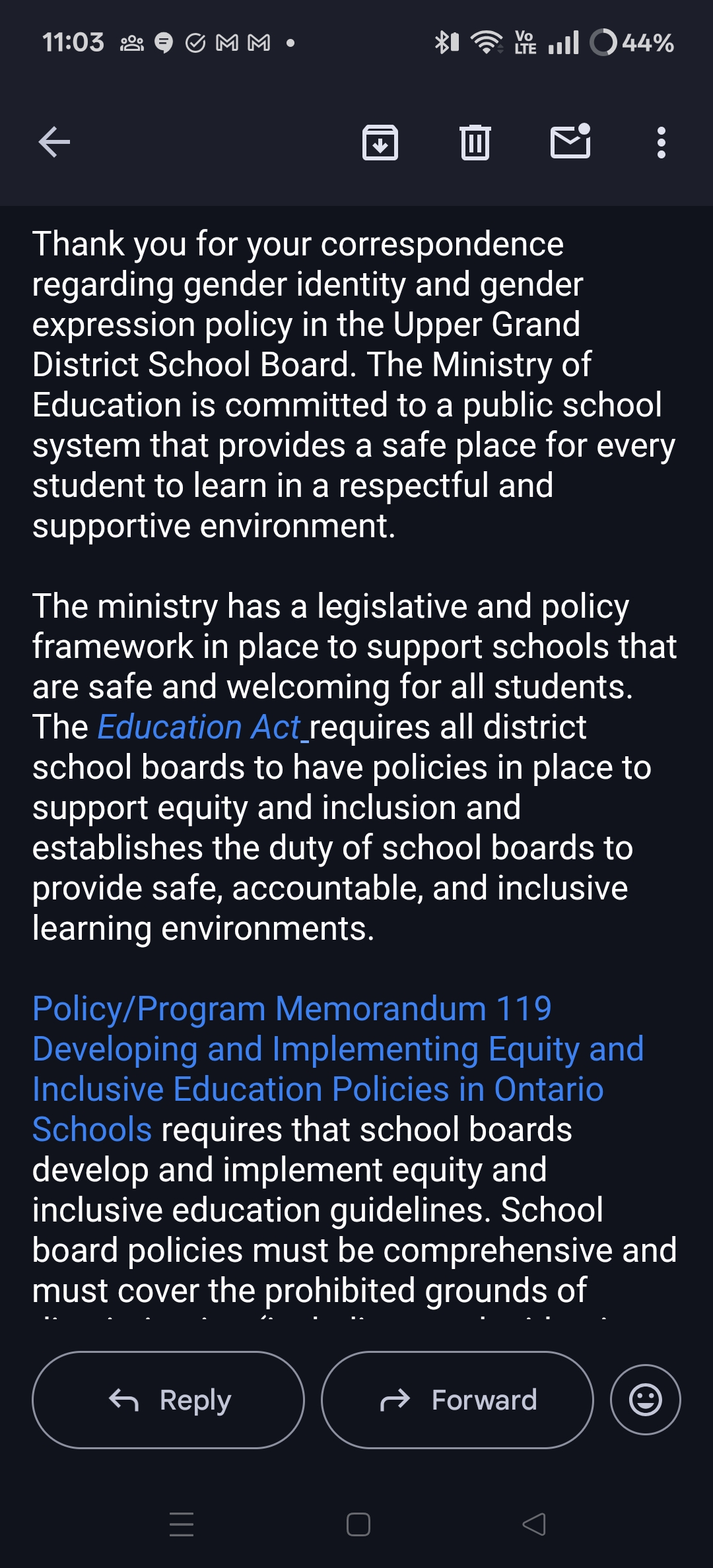 Only recently did the Ministry of Education acknowledge the issue — and then only through a generic response from the Inclusive Education and Well-Being Branch (IEPEB). Rather than address the core concerns, the Ministry passed the responsibility to the local school board, stating: